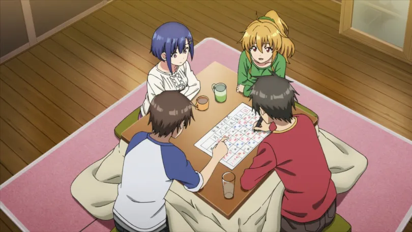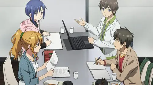 On va donc suivre Kyoya dans sa nouvelle vie à l'université où il se retrouve en coloc avec deux filles et un gars qui, par la plus grande des surprises, constituent la génération platine (c'est pas vraiment une révélation, comme on s'en doute assez vite). Ainsi, il devient ami avec une illustratrice, une chanteuse et un écrivain, tous les trois des personnes à succès en devenir dans son futur. Kyoya va donc profiter de cette nouvelle vie pour se rapprocher d'eux et pour entreprendre des projets créatifs. L'anime nous raconte alors leur collaboration non seulement dans la vie de tous les jours mais aussi lors de plusieurs travaux pratiques et présente ainsi le processus créatif. Malgré tout, on n'est pas sur du Blue Period, on ne nous explique pas concrètement comment on produit un film ou un jeu vidéo, l'aspect réflexion reste assez superficiel, en plus de rendre les choses un peu trop simplistes par moments. La série préfère avant tout de suivre l'évolution d'un groupe et des relations des différents membres avec le personnage principal… Ainsi que de se focaliser plus particulièrement sur les filles qui veulent se taper Kyoya. Bokutachi no Remake, c'est une tranche de vie étudiante saupoudrée d'un carré amoureux (parce que oui, elles ne sont pas que deux, il y en également une autre) et de sauts dans le temps. Finalement, la série se révèle être récit léger pas désagréable à suivre. Et justement, nous vous parlions de saut dans le temps...